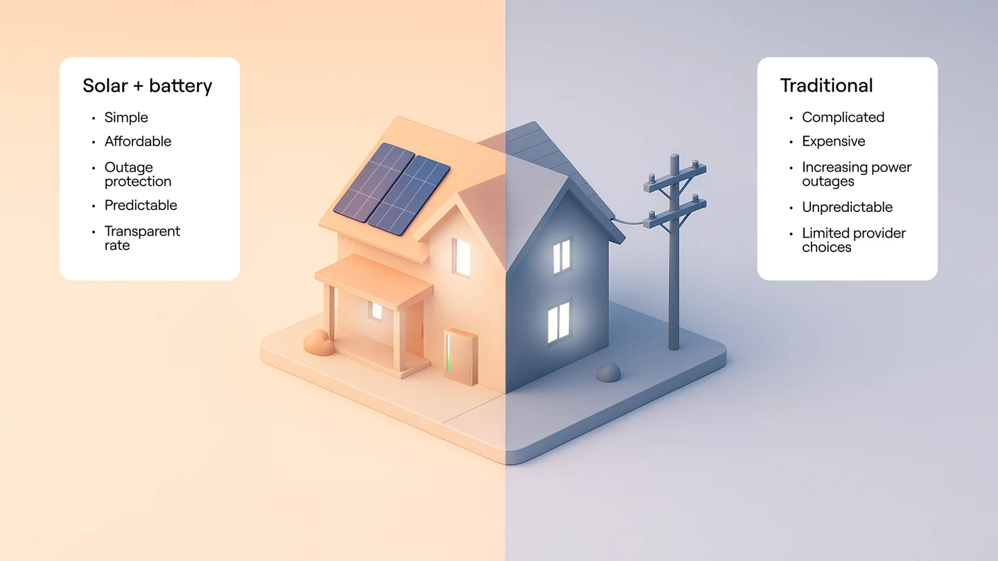 Traditional energy: Your energy costs are subject to continuous utility rate increases. These companies often operate without competition, leaving you with little control as they are incentivized to raise rates to cover their expenses.